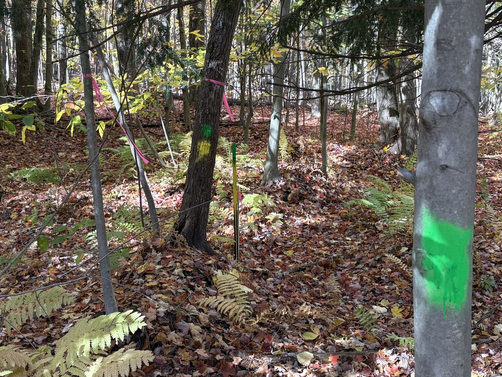 See the trail map and color-coded survey layout—each lot is marked with property stakes for easy identification.